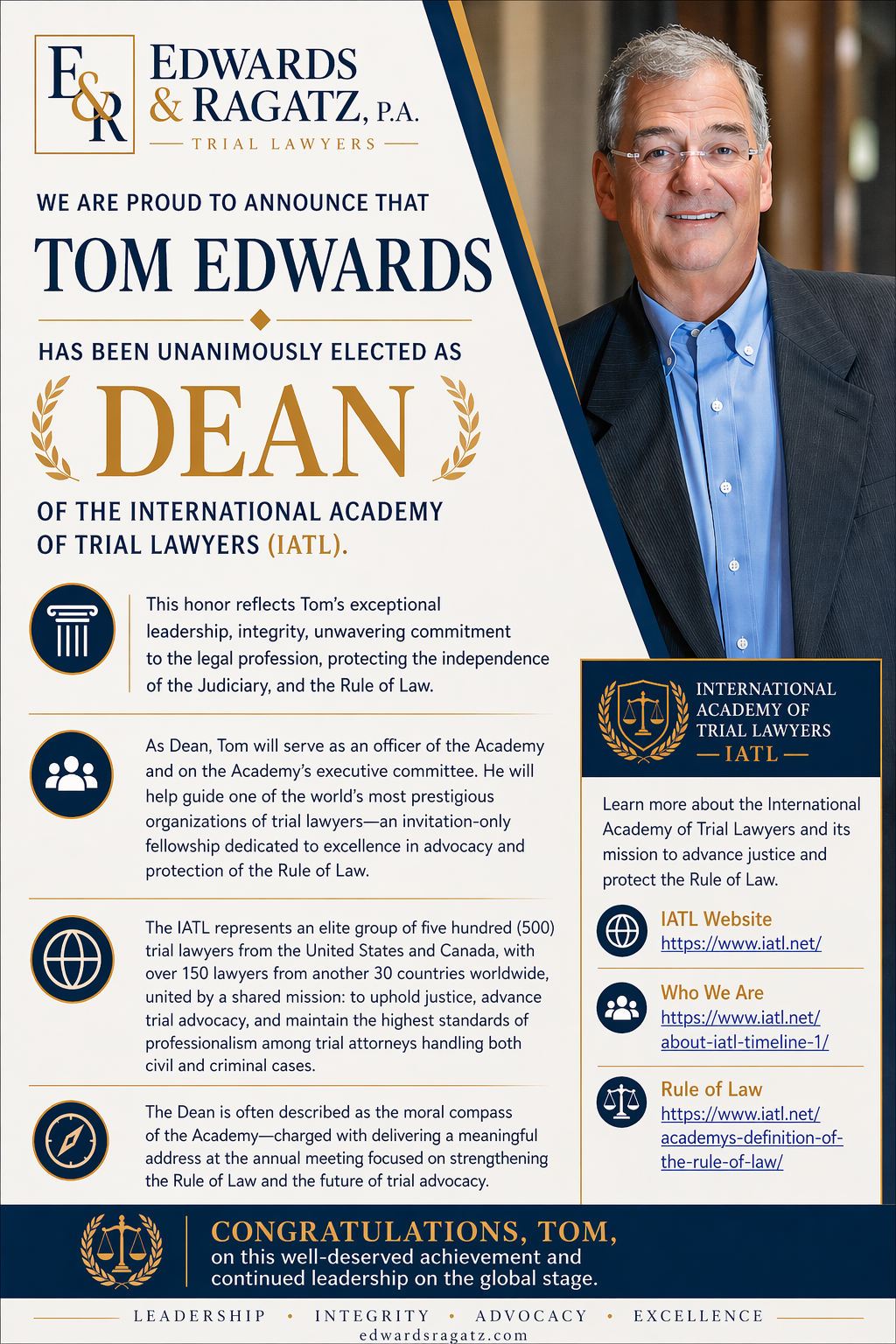 Our team at Edwards & Ragatz, P.A. is proud to announce that Senior Partner Tom Edwards has been unanimously elected as Dean of the International Academy of Trial Lawyers (IATL).